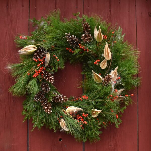 Celebrate the season by crafting your own evergreen wreath with guidance from Head Gardener Helen Westergren. Each student receives a 14” wreath frame, piles of fresh greens, decorative items, and a ribbon to create a beautiful, custom piece to take home. Finished wreaths are typically between 22″–26″ in size — perfect for doors or walls.