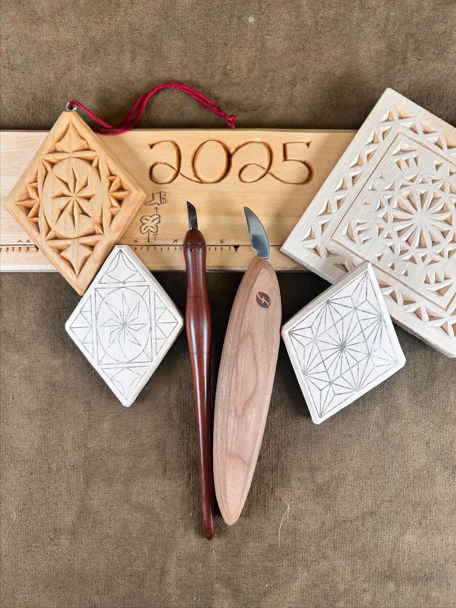 We’ll begin with chip carving, a method found in many cultures but celebrated in the geometric Swiss style and the flowing, organic patterns of Scandinavia. You’ll start by carving a series of holiday ornaments, each one a little more intricate than the last. Along the way, you’ll learn how to hold and guide your knife for clean, confident cuts, how to read the direction of the grain, and how to let light and shadow bring your designs to life.