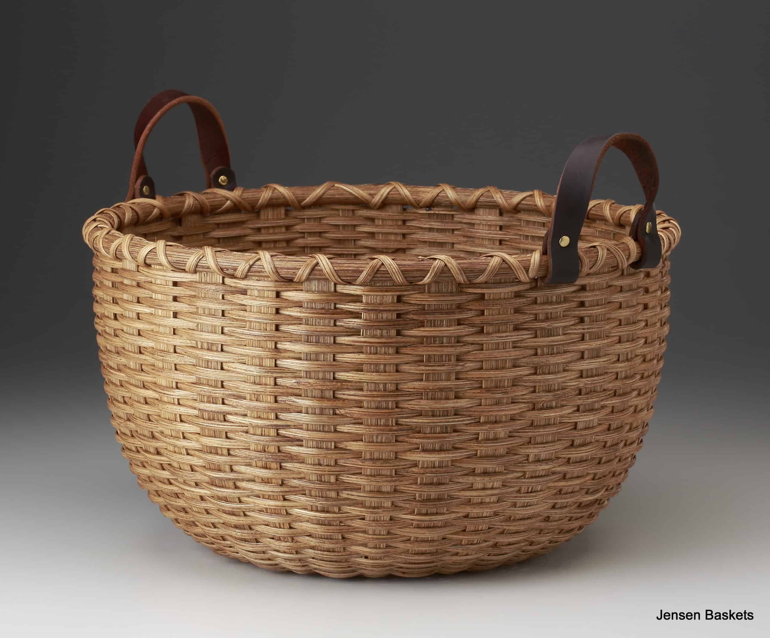Starting with a simple spoked base using rattan, students will taper a second set of stakes to create this double spoked base basket creating a starlike center to the base. Students will then weave and shape the sides of this handsome, utilitarian round basket with a continuous weave. The basket is finished with a sturdy rim and leather side handles. Shaping, rimming, scarfing and lashing will all be taught. Basket dimensions is approx. 8″ H x 13″ in diameter.
