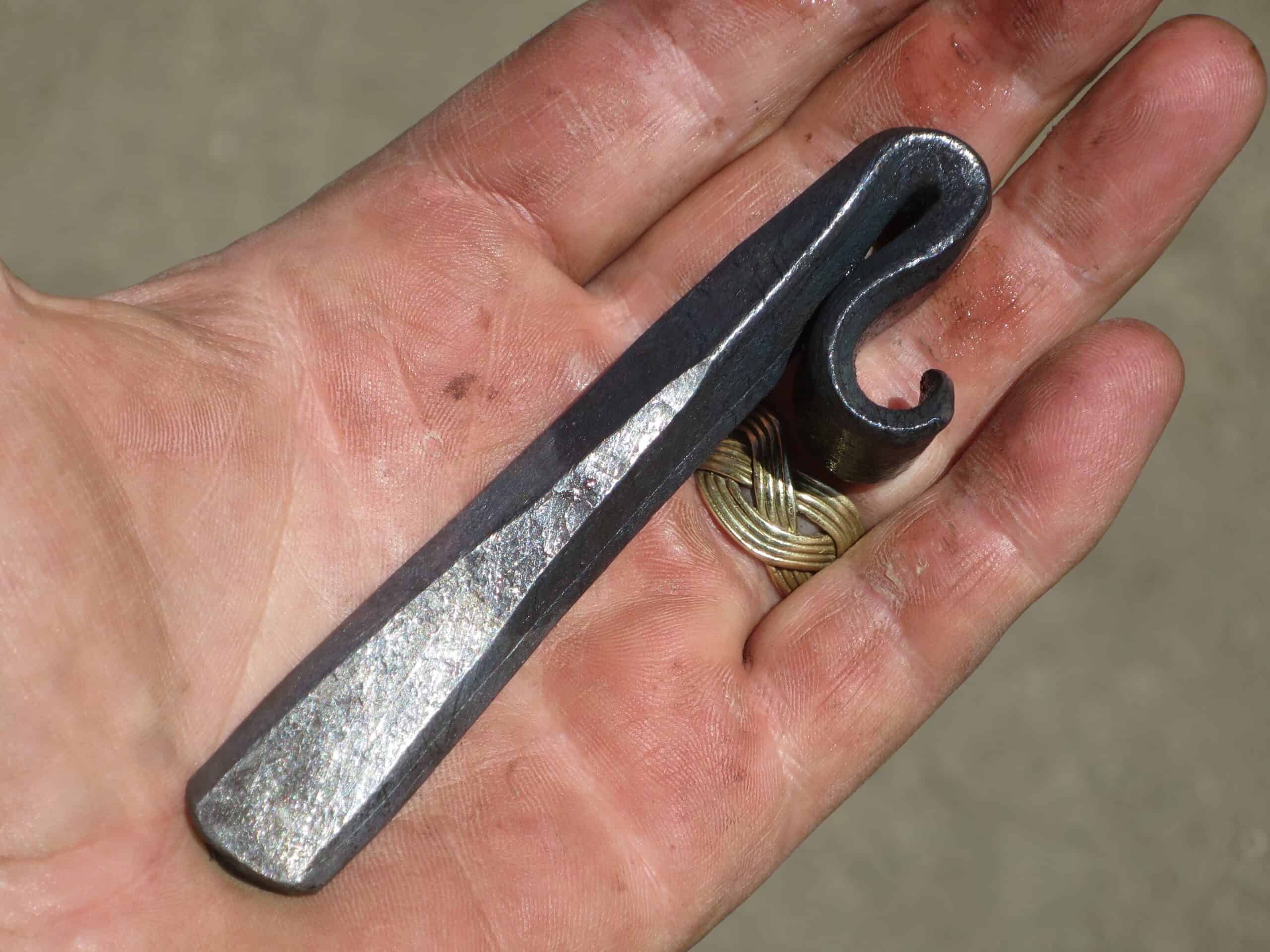 We’ll finish up trying to forge a lovely little cheese knife. The original design is from Iron Age Scandinavia (where archaeologists named it “kvinde kniv”- ‘woman’s knife’). This will expand further on our growing tapering and scrolling skills. We’ll use the back end of the hammer (peen) to form a nice little triangular blade on the knife.
