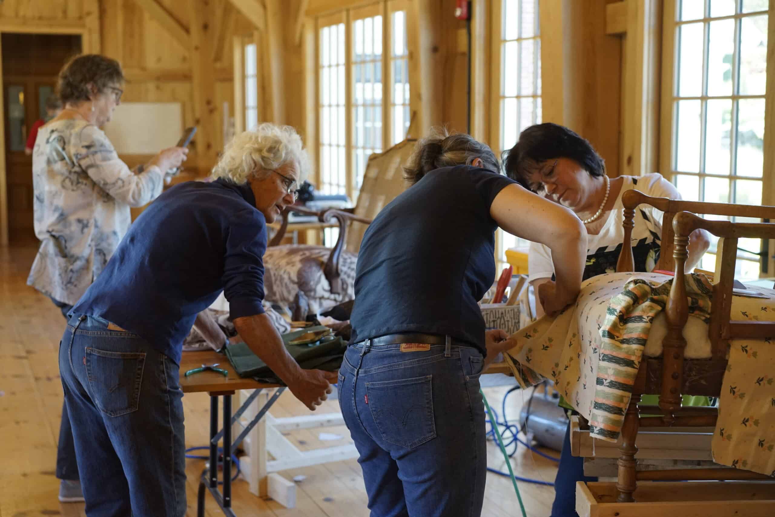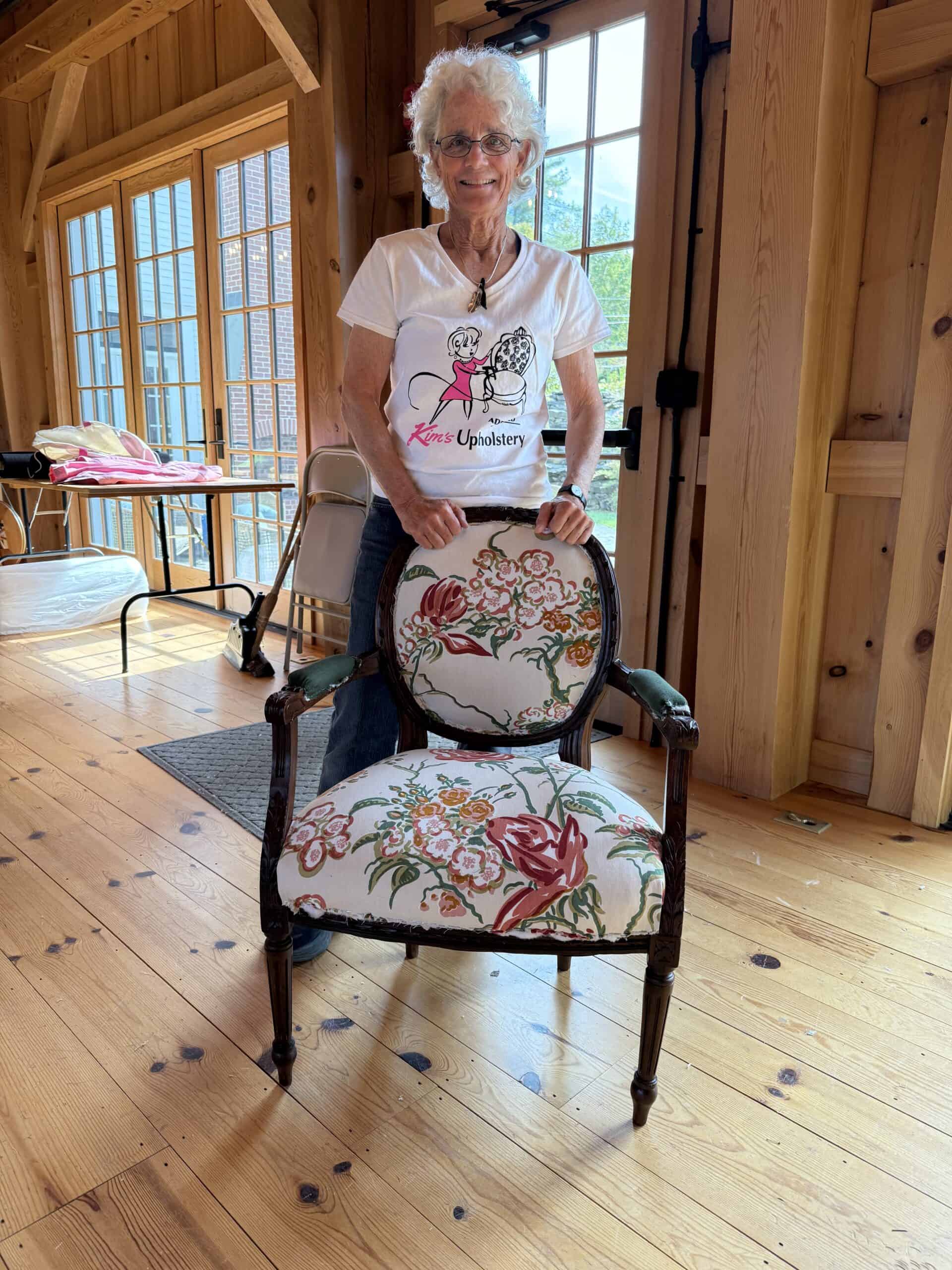 When you’ve completed the three days, you will be taking away much new knowledge and confidence to try more pieces independently. We limit the class to only six students so you will have one-on-one instruction. By the end of the workshop, you will have a finished piece to be proud of. Prior to this small chair upholstery workshop, students must submit a picture of the project they would like to work on for approval. Choosing the right chair to reupholster will help them complete the project within the allotted time frame. Please email pictures to me, Kim Chagnon, at kimberley@kimsupholstery.com. As you tear down your chair, take notes of the supplies you will need to bring to the workshop. I encourage you to refer to this printable tools and supplies list as well. Students are responsible for obtaining all their own supplies, tools, and fabrics for their project. If you have any questions about the supplies needed, please email Kim. Fabric yardage can be determined by watching the “Measuring for Fabric Yardage” video, which is available here: https://kimsupholstery.com/measuring-for-fabric-yardage/